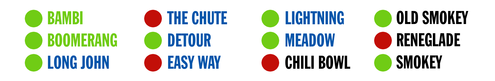 Trail name font colour indicates the trail difficulty rating